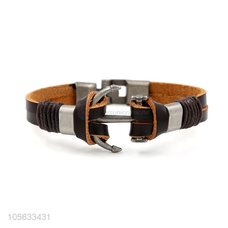 Top selling custom men braided leather bracelet alloy anchor charms bracelet