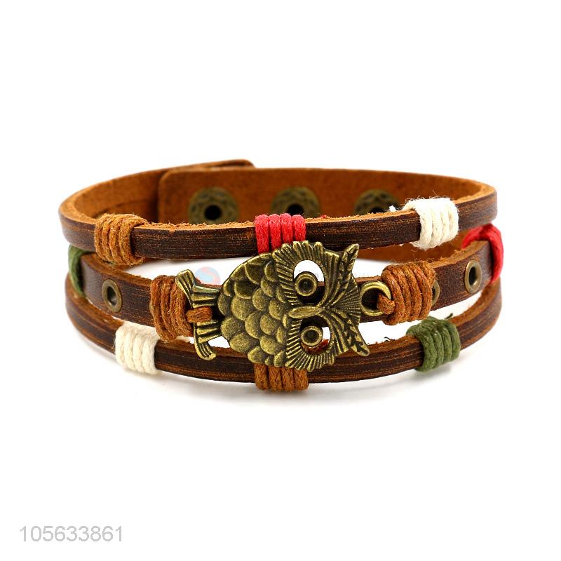 Factory OEM owl charm custom men braided leather handmade bracelet
