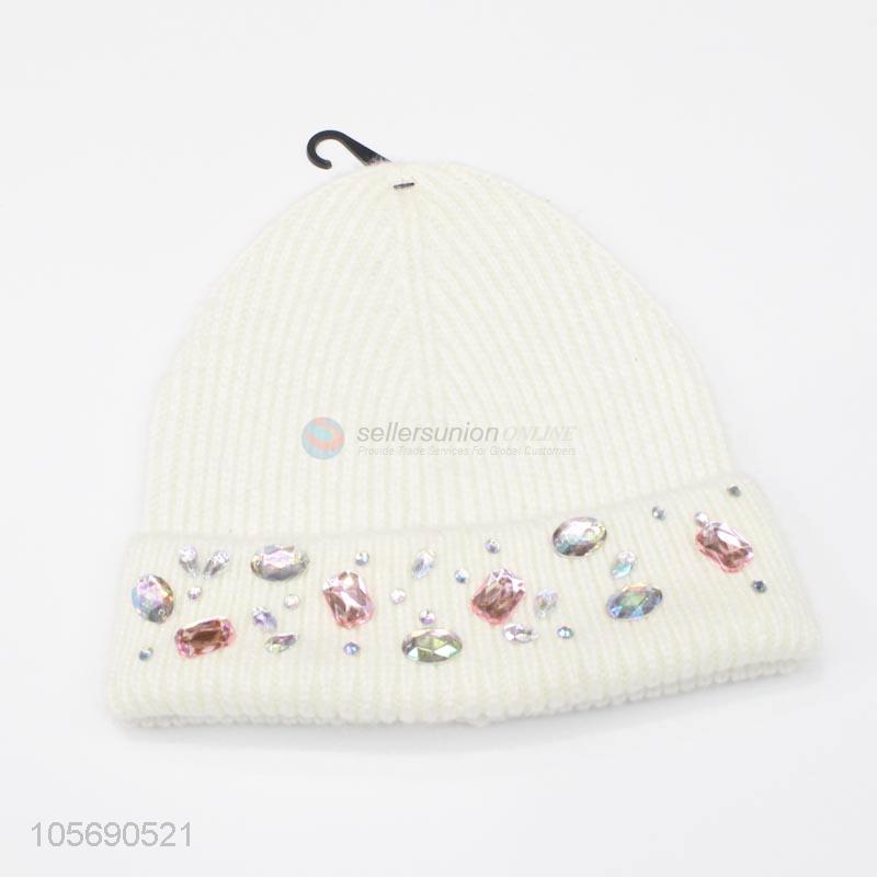 Cheap Professional Whire Winter Warm Knitting Hat with Rhinestone