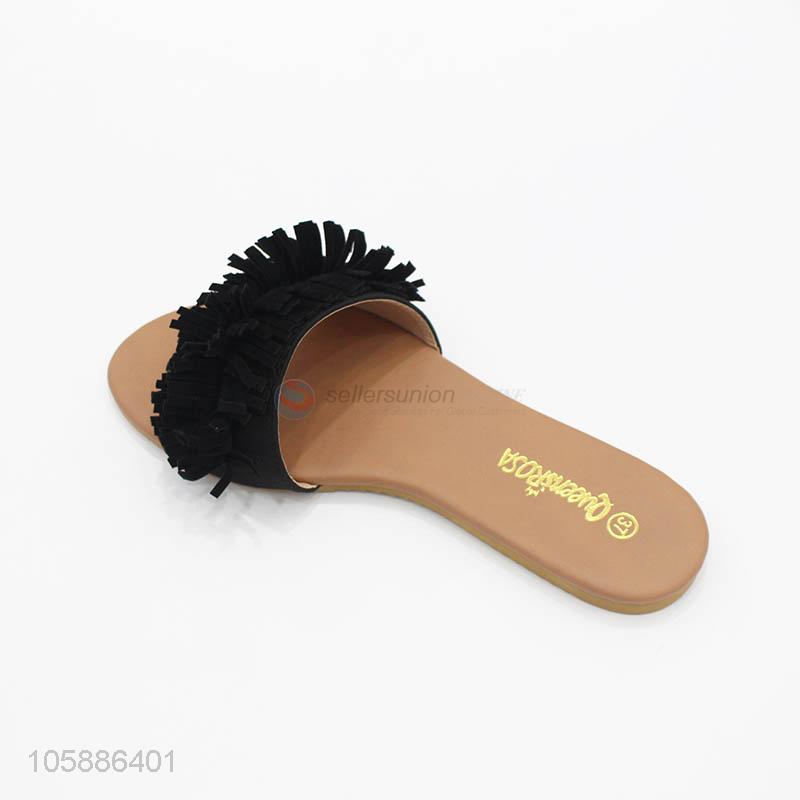 Superior quality stylish women faux suede fringe peep toe slippers