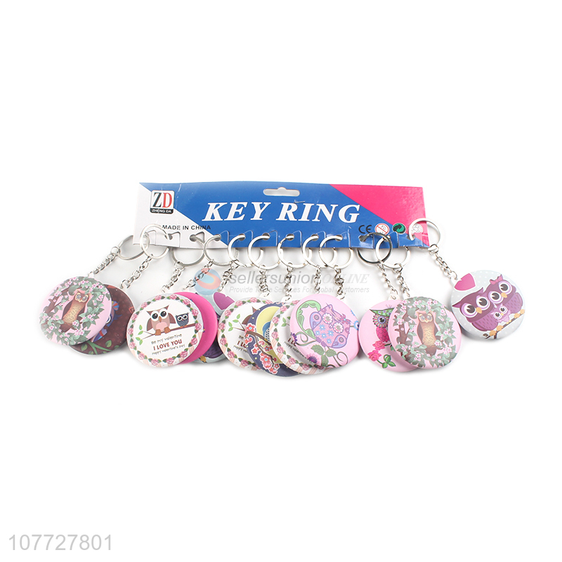 Low price round owl printed single sided cosmetic mirror key chain keyring