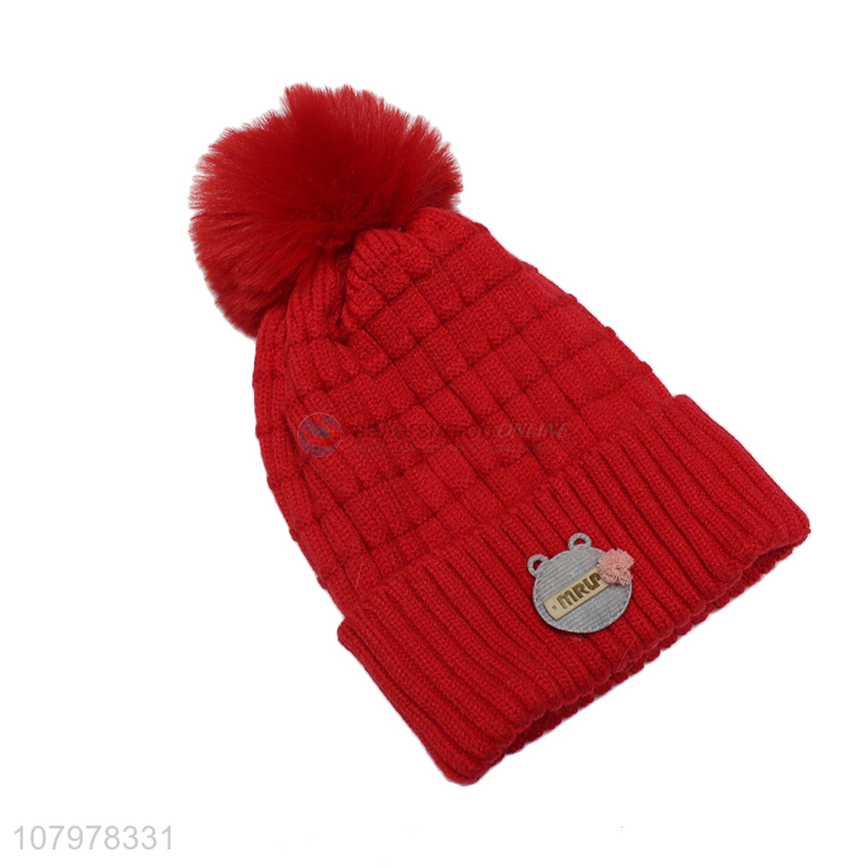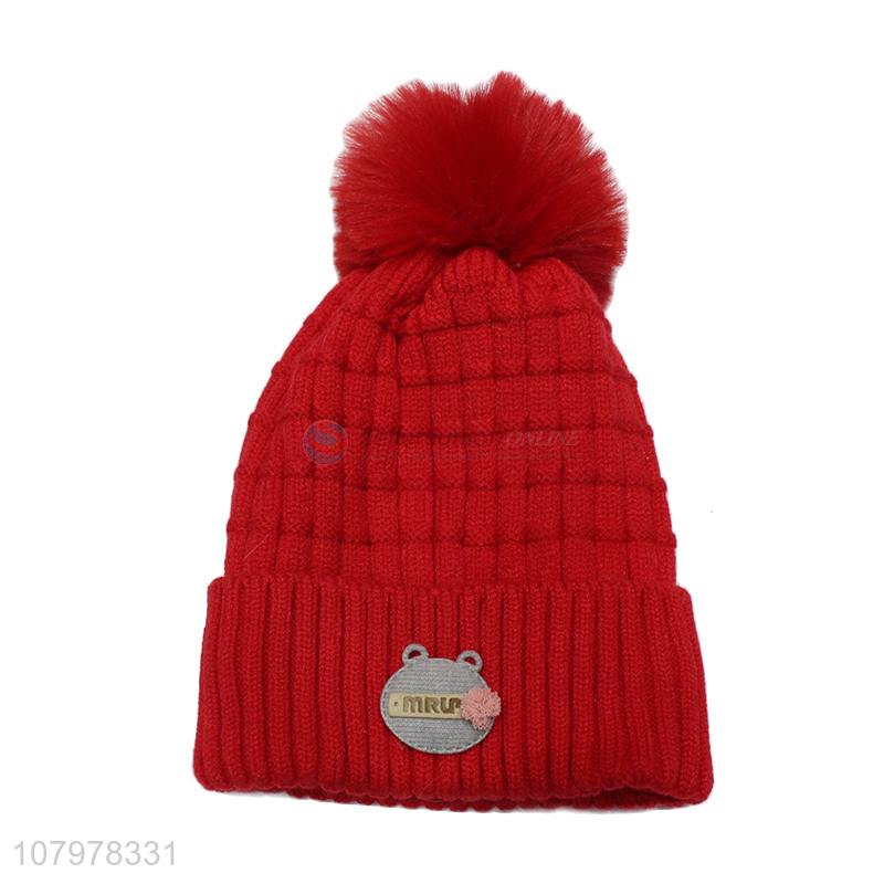 Recent design kids winter fleece lined knitted beanie cap with pom pom