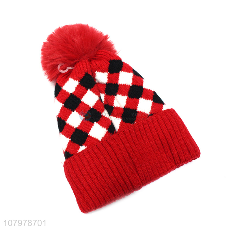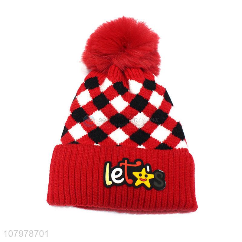 New hot sale kids winter fleece lined knitted beanie with faux fur pom pom